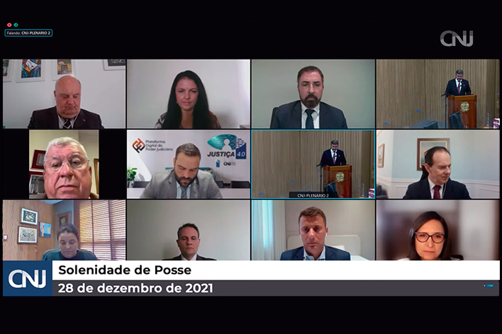 A desembargadora federal Salise Monteiro Sanchotene (canto inferior direito) participou da solenidade por videoconferência.O presidente do Supremo Tribunal Federal (STF) e do CNJ, ministro Luiz Fux, também desejou êxito e enalteceu o currículo dos magistrados empossados.