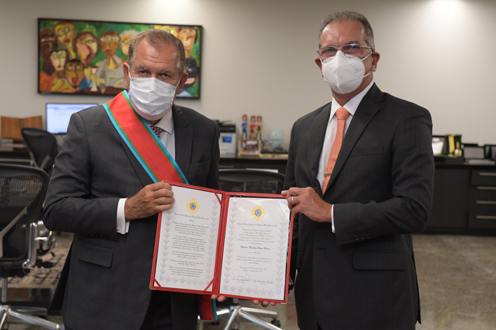 A comenda foi entregue em mãos ao ministro pelo presidente do Tribunal de Justiça de Mato Grosso do Sul (TJMS), o desembargador Carlos Eduardo Contar. Pelo TJMS, também esteve presente o juiz auxiliar da presidência, Eduardo Siravegna.